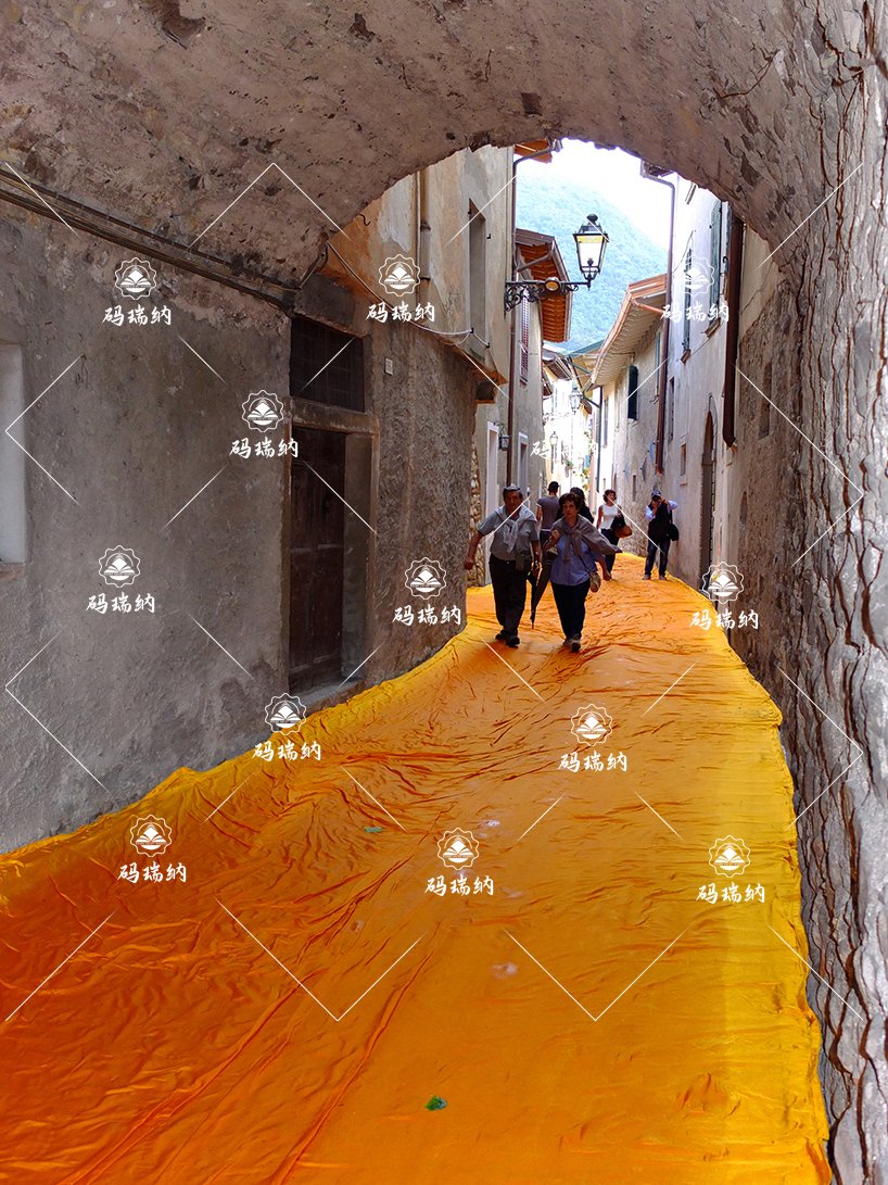 6月18號,藝術(shù)家 Christo創(chuàng)建的『水上浮橋/floating piers』公共藝術(shù)裝置完工,并正式向公眾開放。從空中或山上向下俯瞰,可以看到有近十萬平方米的明亮黃布覆蓋在水面的人行步道、覆蓋在巷道和廣場上,連接著意大利伊塞奧湖的幾個(gè)碼頭,總長度有3公里。游客可以從陸上的 sulzano 小鎮(zhèn)啟程,一路沿著隨水波微微晃動(dòng)的黃色步道穿過水面抵達(dá) monte 島,接著通向居于湖中的 san paolo 小島。